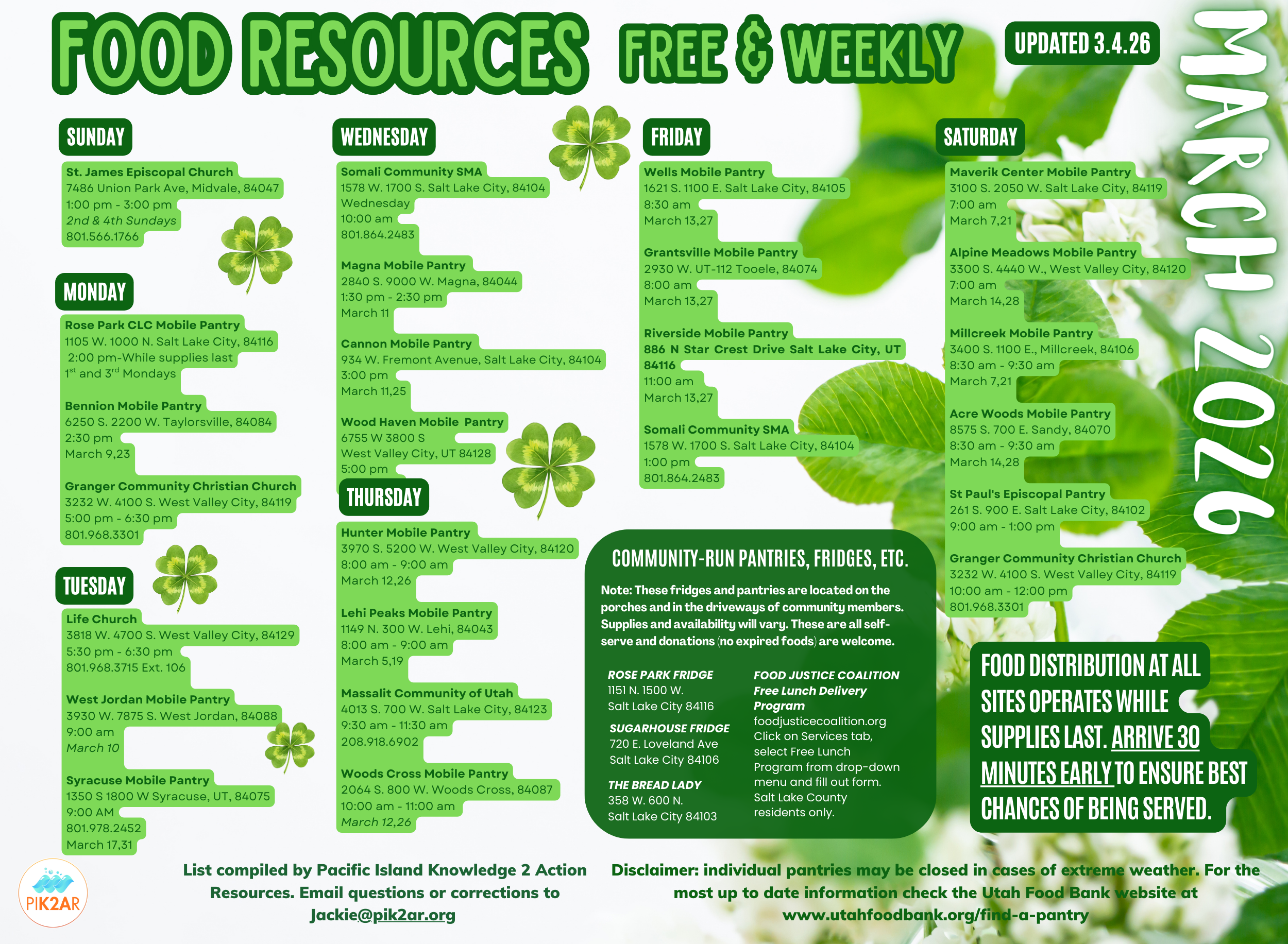 We have a Food Resource List for Salt Lake County. If you have a resource to add to the list please contact us at info@pik2ar.org.
